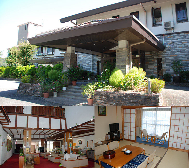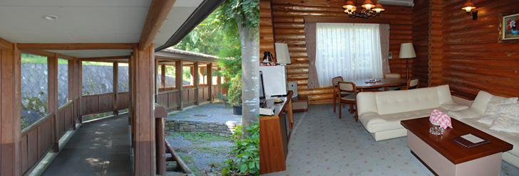 宿は「新たんば荘」。森の坂道を登るとクラシックな北欧風の建物が迎えてくれる。吹き抜けのロビーがある本館は純和風の部屋。渡り廊下でつながっているログハウスの部屋は、木が持つあたたかい雰囲気に包まれて、部屋全体がリラックスできるムードだ。