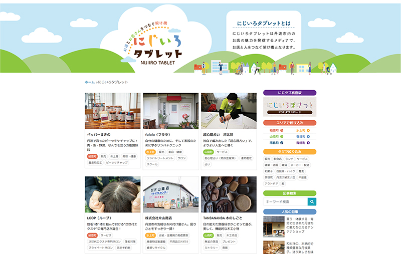 丹波市内の事業所を紹介するポータルサイト「にじいろタブレット」の取材執筆、パンフレット「にじいろぽけっと」の制作を行っています。